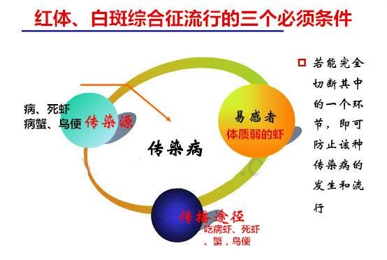 看看這個圖,你要想一個疾病流行,必須這個三個環節是連在一起的。一個是傳染源、一個是易感者,一個是傳播途徑。那么傳染源是什么呢?病蝦、死蝦、病蟹和鳥的糞便它們就是傳染源。傳播途徑就是吃了它。易感者也就是體質弱的蝦。