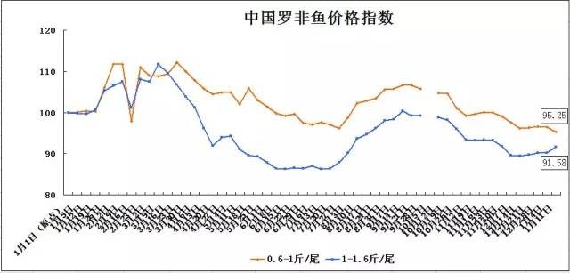 本統計周(01月05日-01月11日)1斤以上規格羅非魚價小幅上漲,其他規格魚價略有下調。2016年01月11日,中國羅非魚價格指數收報點如下:0.6-1斤/尾規格指數收報點95.25,環比上一統計日(01月04日)下調1.22點;1-1.6斤/尾規格指數收報點91.58,環比上調1.35點。業內人士分析,年底加工廠放假,整體魚價趨于下滑,而由于存塘魚量有限,1斤-2斤走市場規格魚價有小幅上調空間。