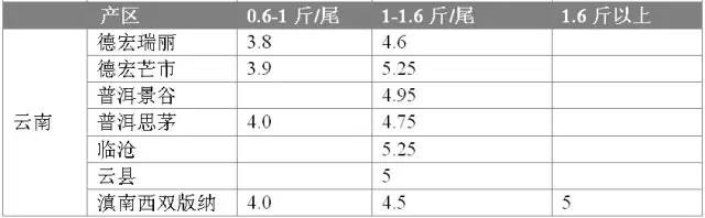目前云南產區400-500克規格的成魚占5-6成。西雙版納州-景洪9元/公斤,勐臘9元,規格500克以上,走量少;勐海9元,平均規格500克以上,價格與上周持平。普洱地區,思茅,寧洱,普文價9.5元/公斤,500克以上,且必須有大規格面子魚(700-1000克以上的),相比上周,價格相對持穩。景谷地區9.8元-10/公斤,德宏州瑞麗9.2元/公斤,芒市10.5元/公斤(規格750克)。臨滄雙江、永康等內銷市場相對較高,價格10.5元/公斤(500克以上規格)。